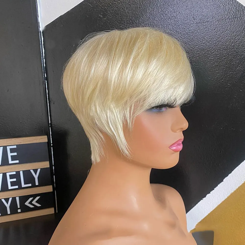 613 Blonde Wig Human Hair Short Pixie Wig Human Hair for Women 6 inch Chic Duby Wigs with Bangs Cheap Full Machine Cosplay Wig